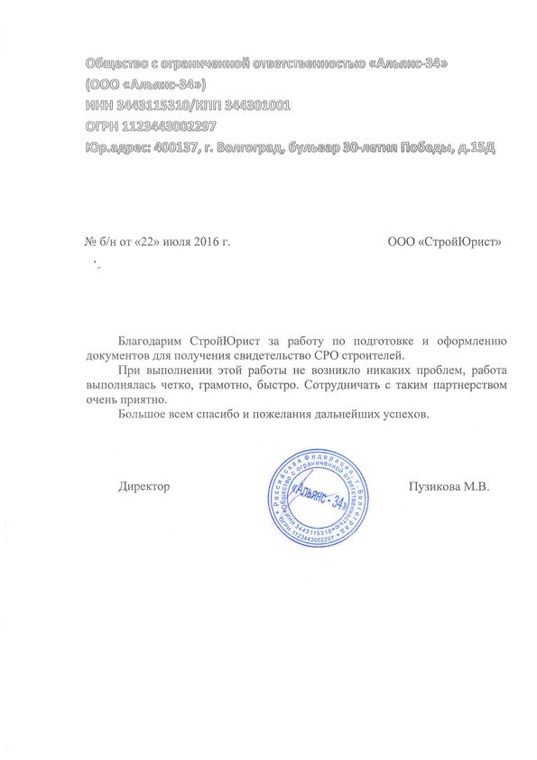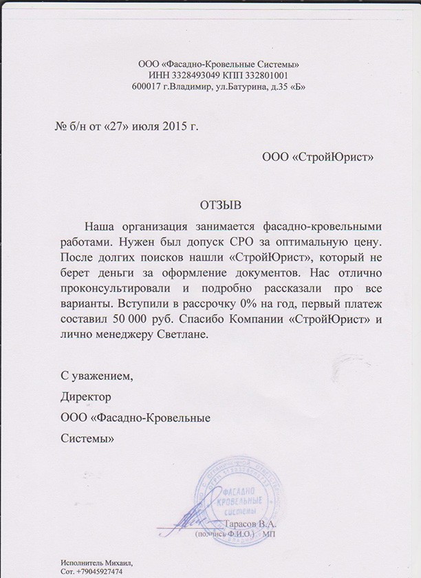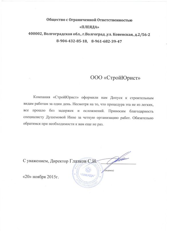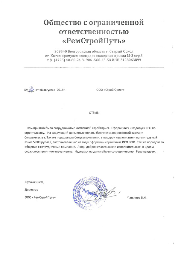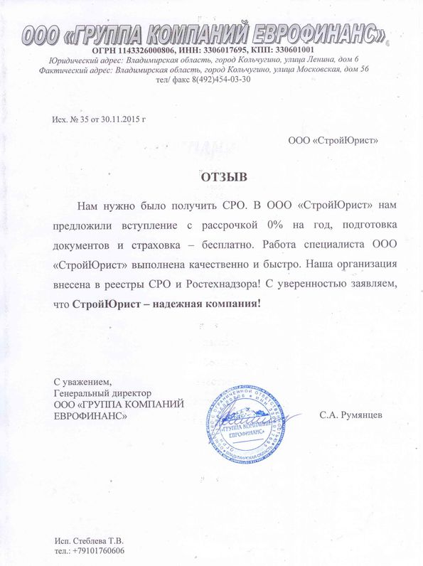 Отзывы клиентов "СтройЮрист" по вступлению в СРО в Тамбове